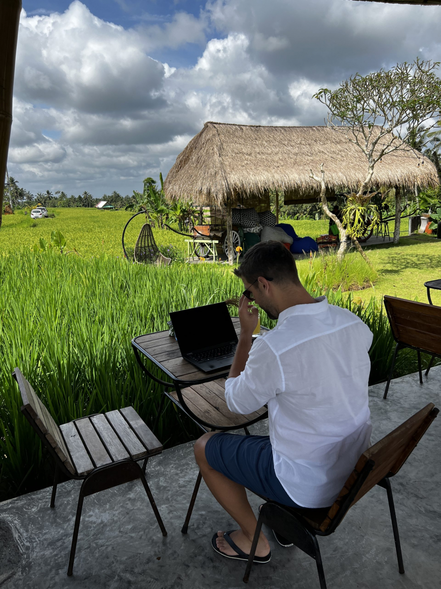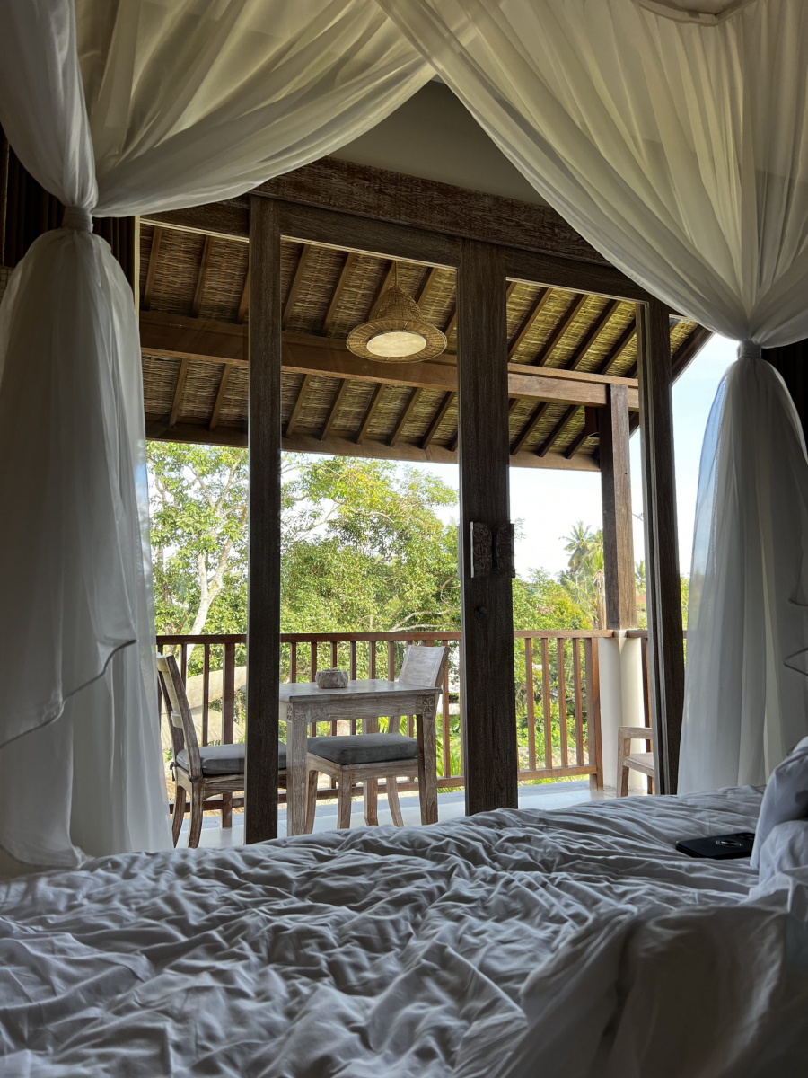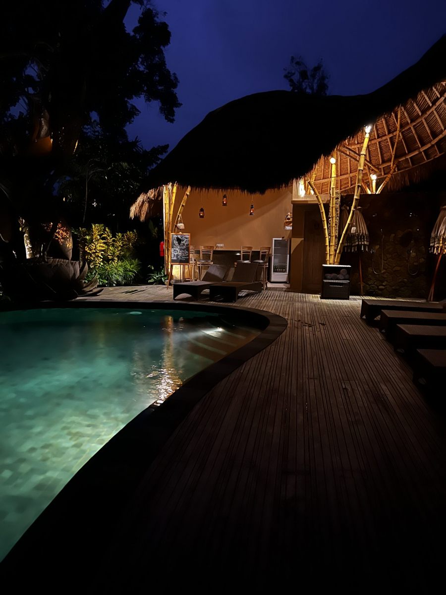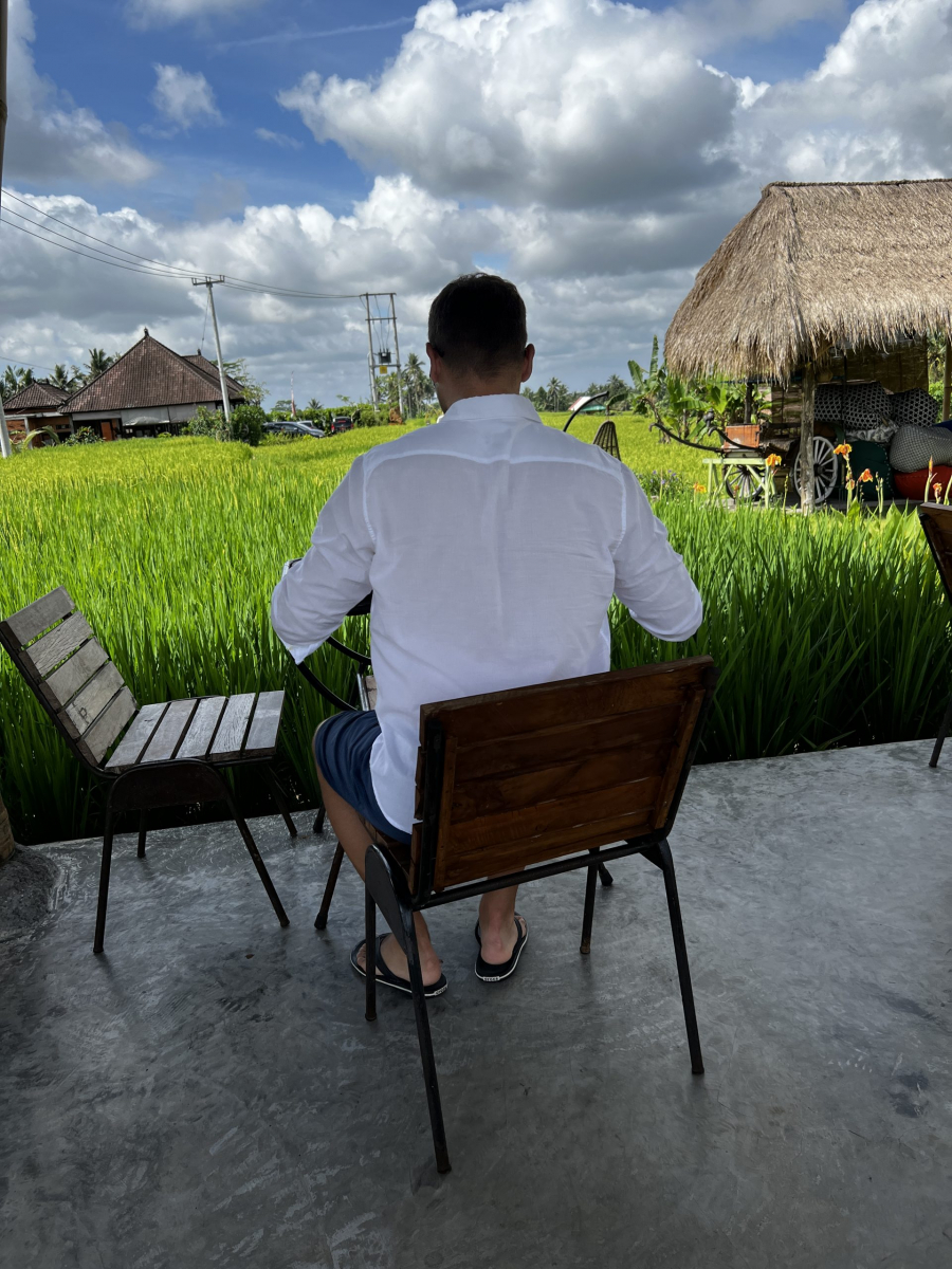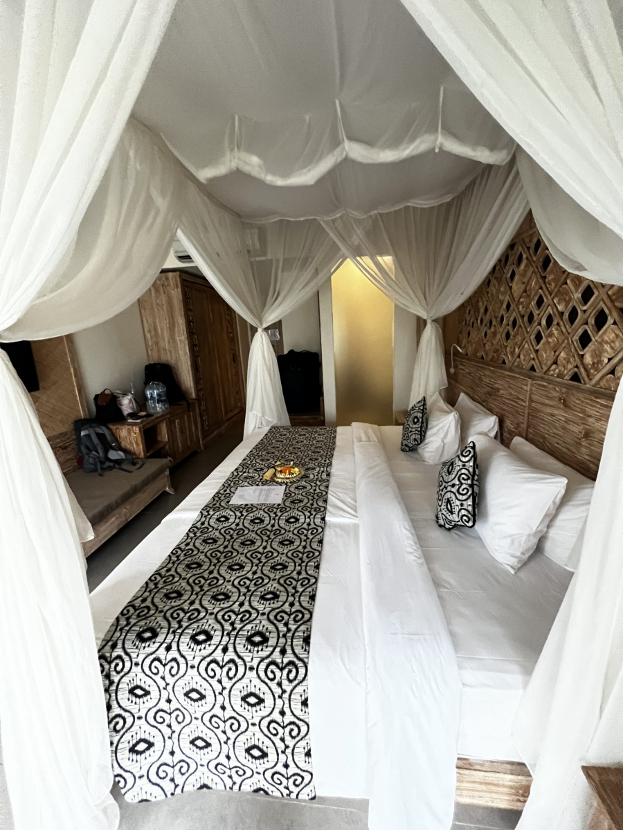 - Ein paar Worte zum Hotel: Ich bin froh, dass wir nicht storniert haben! Unfassbar malerische, wunderschöne Hotelanlage. Wir wurden super herzlich empfangen mit Welcome Drink und Reiszeremonie. Der Pool: mega! Das Zimmer: mega! In die Jahre gekommen: Höchstens die ein oder andere Fuge im Bad. Ansonsten alles top in Schuss und sehr schick eingerichtet. Schimmelgeruch habe ich auch nicht wahrgenommen, eher riecht es nach Moskitospray. Das braucht man hier in den feuchten Reisfeldern aber auch.