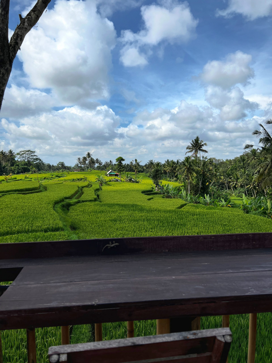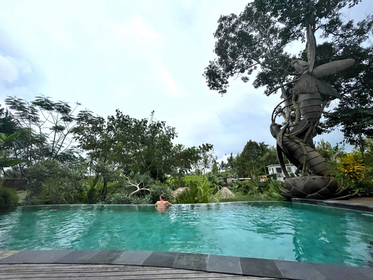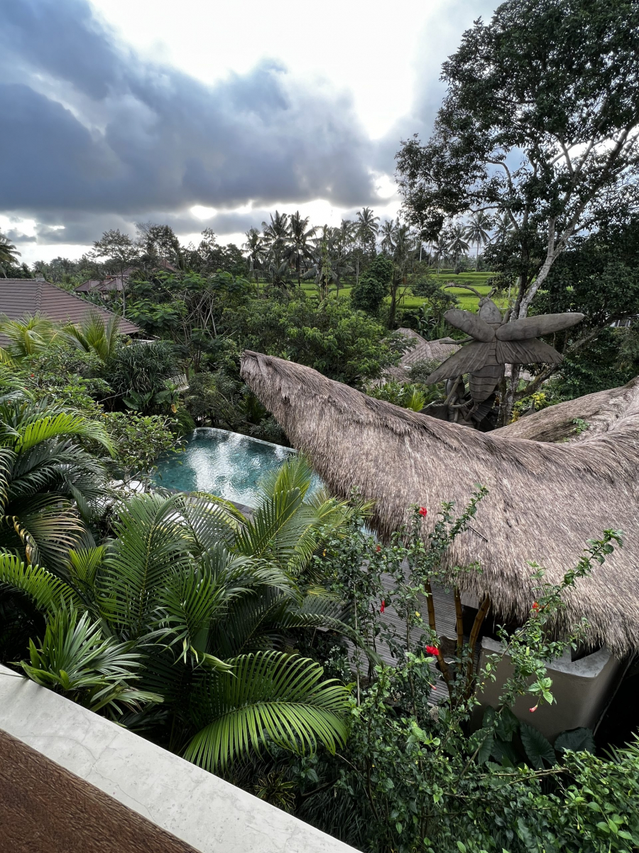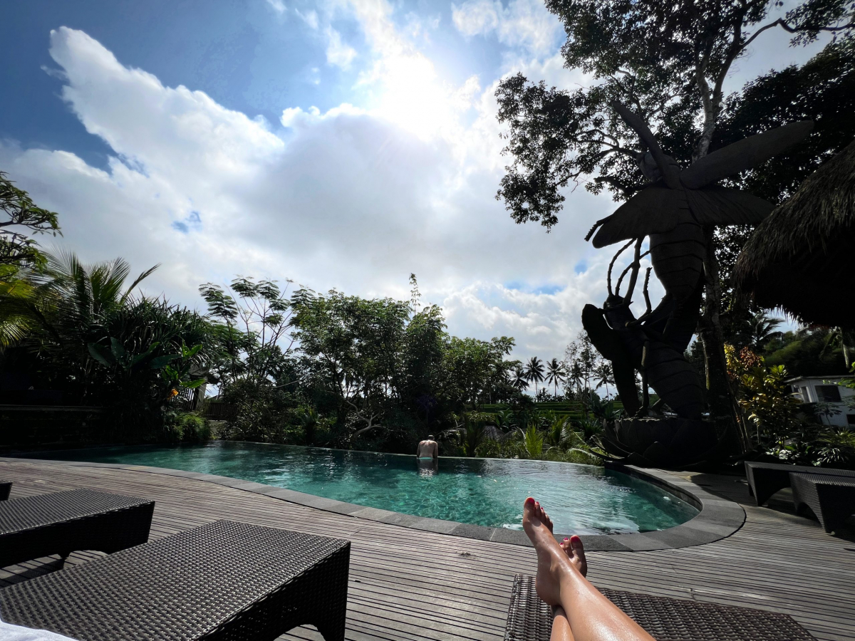 - Wir hatten vorgestern noch kurz überlegt, ob wir das Hotel spontan stornieren und näher in Ubud logieren. Es ist etwa 20 Minuten von Ubud entfernt, mitten in Reisfeldern. Ich hatte Sorge nicht gut zum Yoga oder zur Massage zu kommen. Und die ein oder andere Google-Bewertung (in die Jahre gekommene Unterkunft, Schimmelgeruch) hatte mich auch verunsichert. Aber stornieren ging nicht mehr (wir hätten dann 250 Euro in den Sand gesetzt. Für 5 Nächte wieder nicht teuer, aber muss ja nicht sein) und andererseits wollten wir ja Ruhe und Entspannung. Erstmal hinfahren und schauen war dann unsere Devise. Und Markus hat sich auch direkt um einen Roller-Lieferservice gekümmert, damit wir mobil sind.