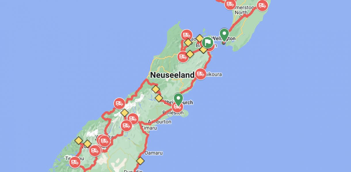 Etwas Statistik zu unserer Route in Neuseeland. Dabei legten wir grob folgende Strecke auf der Karte zurück. So ziemlich jede Ecke von Neuseeland haben wir befahren :- ) Übernachtungen in rot, spezielle Stops oder notwendige Wegpunkte in gelb.
