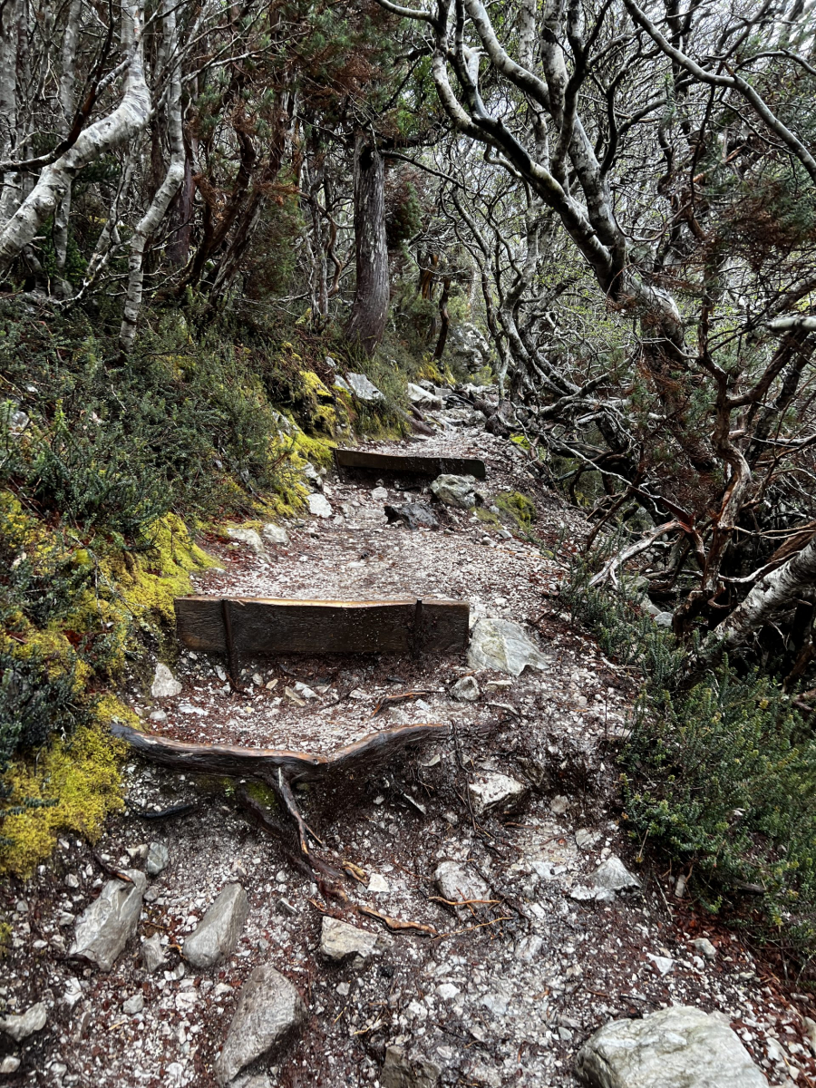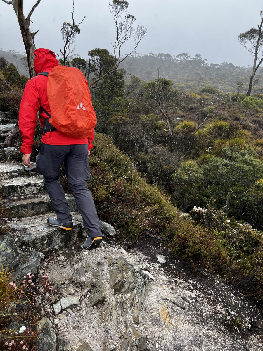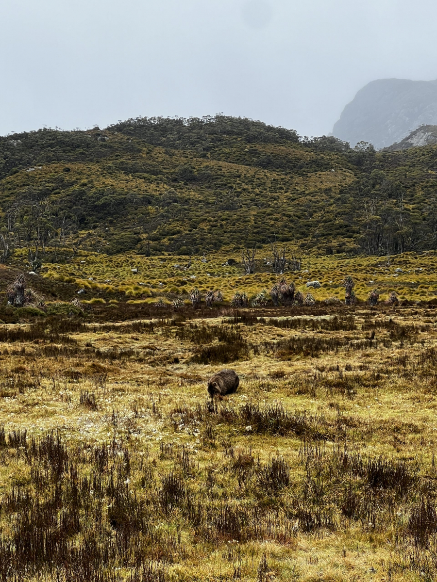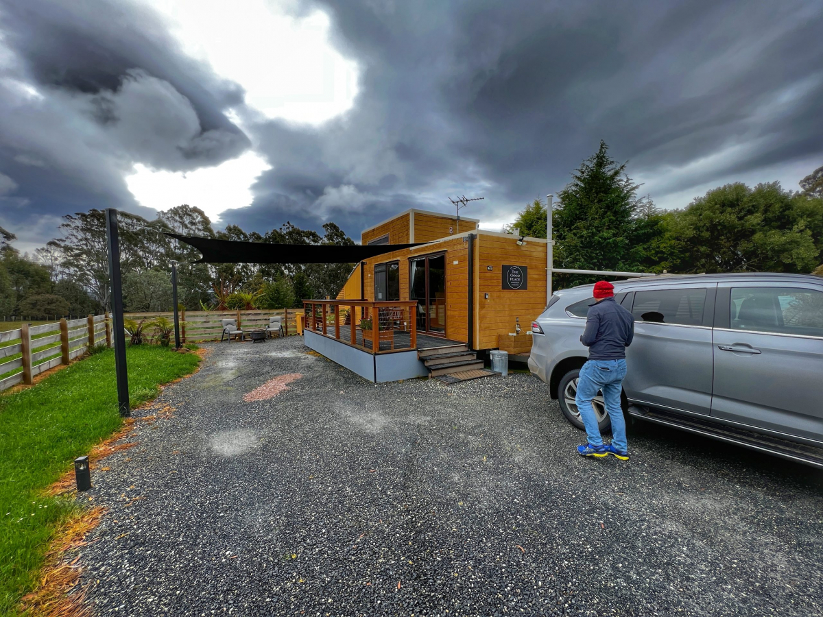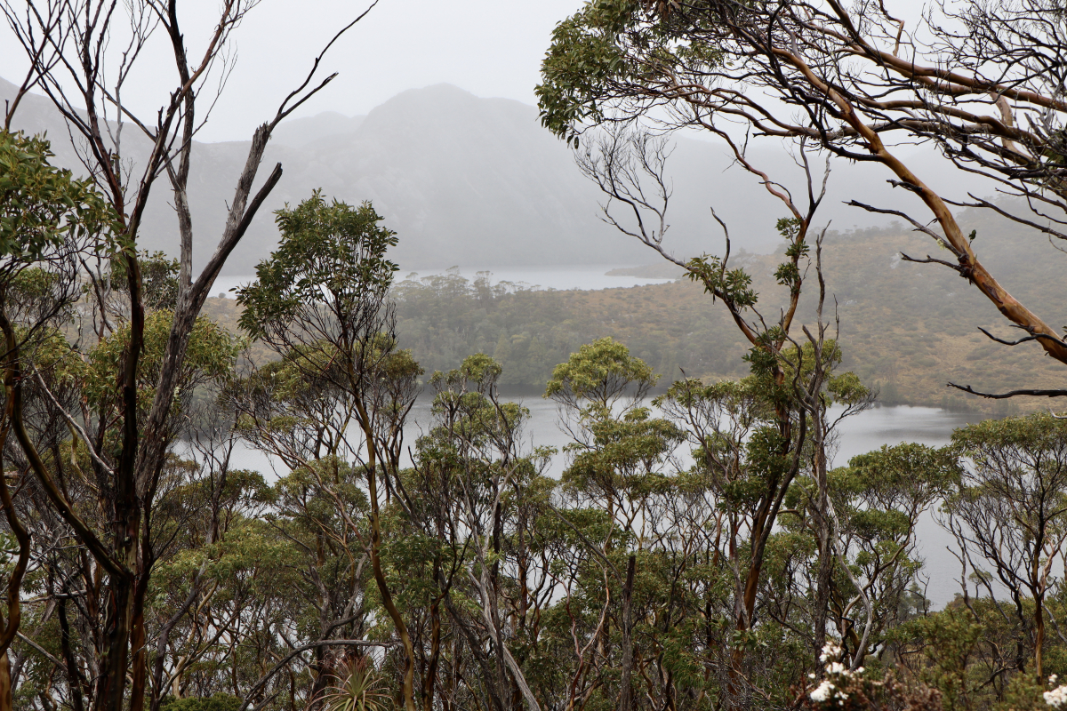 Nachdem ein Photopoint den nächsten jagte, entschieden wir uns noch als Tageshighlight den „Marion’s Lookout“ mitzunehmen. 30 Minuten hoch und wieder zurück – extra – einfach so, für die Geschichtsbücher. Belohnt wurden unsere Mühen mit weiteren Shades-of-Gray und durchweg nassen Hosen. Der Abstieg über Wombat’s Pool zum Dove Lake war dann die vollkommende Vollendung unserer Erfahrung. 8 Kilometer, 3 Stunden, 420 Höhenmeter. Dann Shuttlebus, 2x Chai Latte, Umziehen – und 40 Minuten weiter in unsere nächste Unterkunft, das „Tiny House“. Das Tiny House war eine ausgebaute Anhängerkonstruktion mit Bett im Maisonettestockwerk – freistehend, Landschaftsblick, WLAN und Warmwasser. Es war ein gemütlicher Ausklang eines regenreichen Tages.