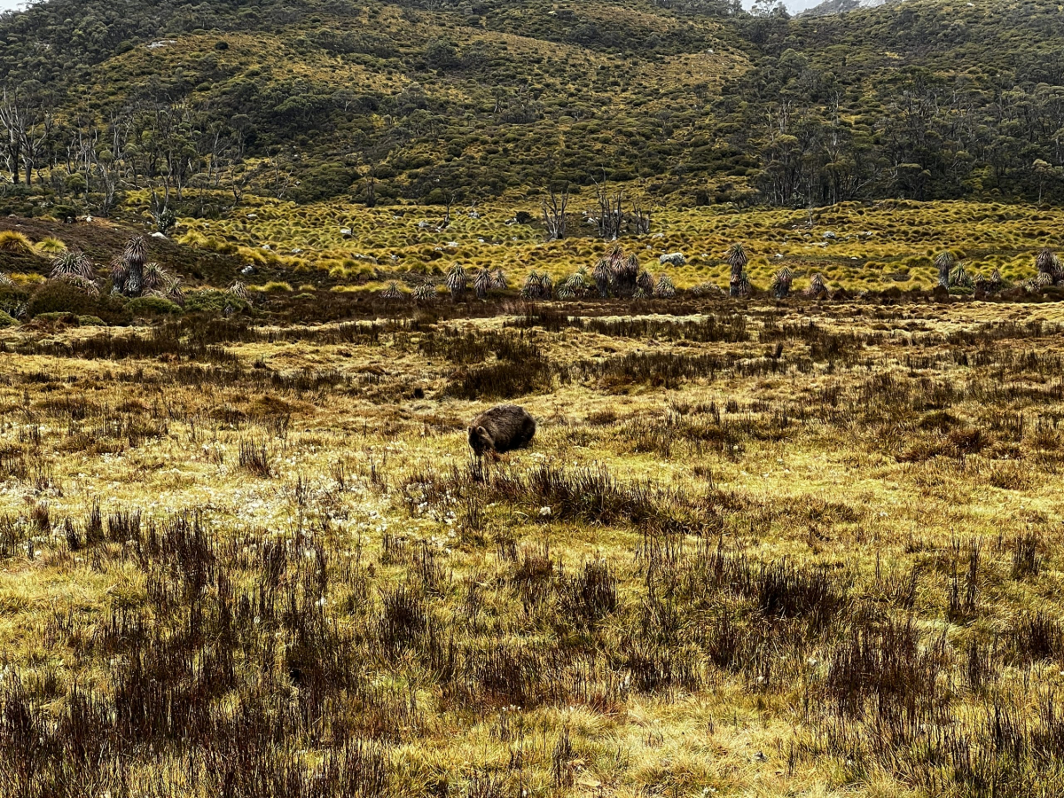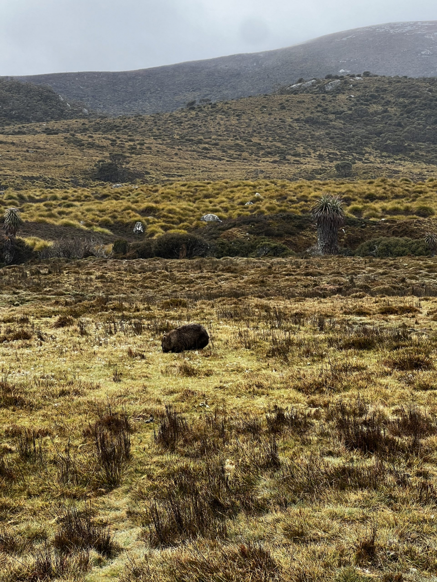 Wir fuhren dann die windige Straße mit dem Bus entlang und lauschten den moderatorisch exzellenten Darbietungen unseres Busfahrers. Prompt sahen wir auch schon das erste Wombat! Heute sollten es ganze zwei werden. Frohen Mutes starteten wir am Ronny Creek Busstop unseren Marsch. Es folgte Wombat 2 nach ca. 200m. Dieses – so ist es ihm hoch anzuerkennen – präsentierte sich außergewöhnlich entspannt in guter Fotoreichweite. Nach unseren Aufnahmen starteten wir dann unseren Weg auf den Holzplanken über die uns mit Sumpf und Büschen unbekannt anmutende Vegetation. Nach kurzer Zeit nahm die Wasserkonzentration drastisch zu und begleitete uns bis zum Ende unserer Tour. An vielen Stellen konnte wir die Schönheit des uns umgebenden Nationalparks erahnen. Die Weiten der Landschaft, die Vielfalt der Tiere, das atemberaubende Zusammenspiel aus tiefblauen Seen und sattgrünem Blattwerk. Nun ja, wir hatten mehr den 50-Shades-of-Gray Tag erwischt.