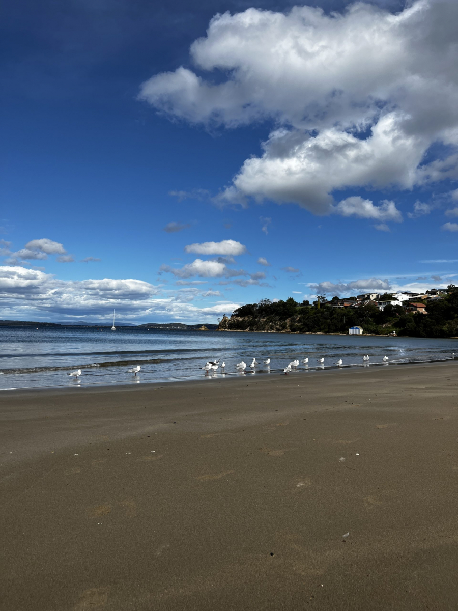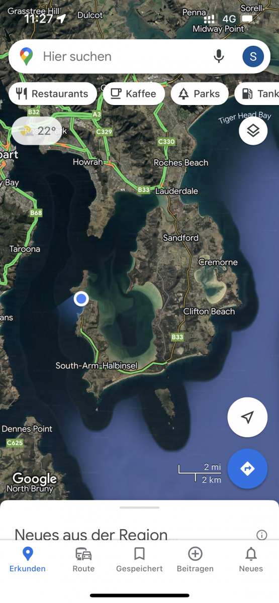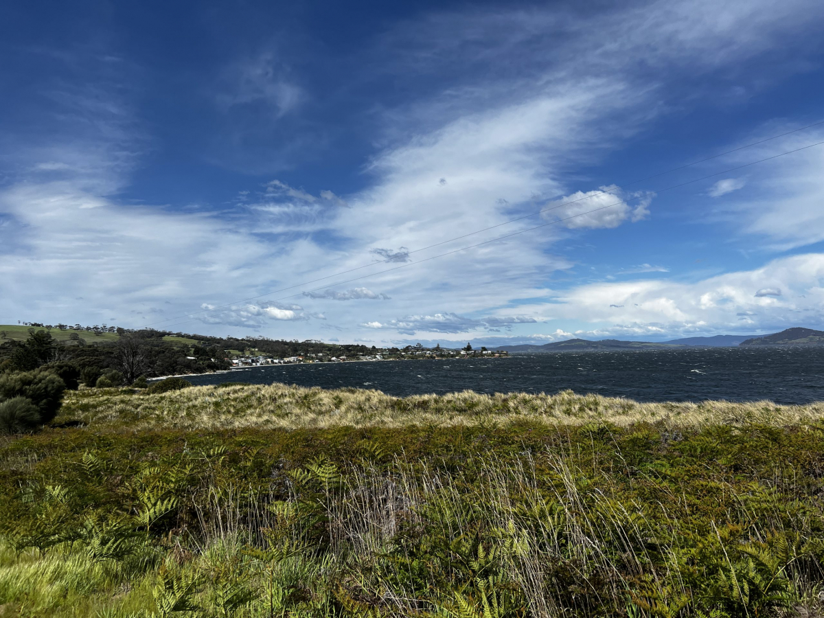 Am Montag war es soweit: Eine Woche Tasmanien neigte sich dem Ende. Nach einem wunderbaren Frühstück in unserem Wombat Studio, machten wir uns auf und erkundeten die Gegend östlich von Hobart. Hier gibt es viele schöne kleine Orte direkt am Meer (South Arm). Das Wetter spielte nur leider wieder verrückt. Plötzlich hatten wir 25 Grad und Sonne. Aber das alleine wäre zu schön, um wahr zu sein: Gleichzeitig brauste ein windiger Sturm über uns hinweg. Die Wetter-App warnte vor Böen mit bis zu 80 km/h. Wir konnten aber dennoch ein bisschen herumfahren und schöne Orte bestaunen.