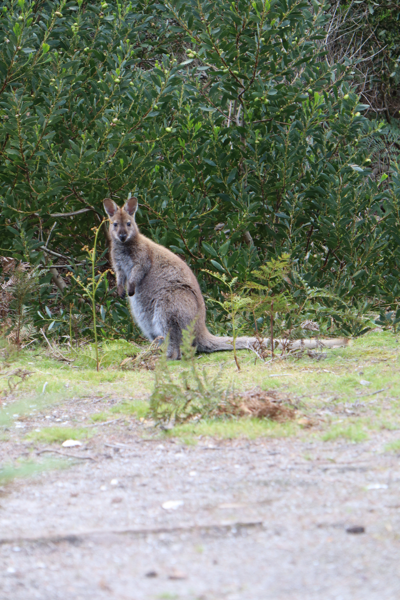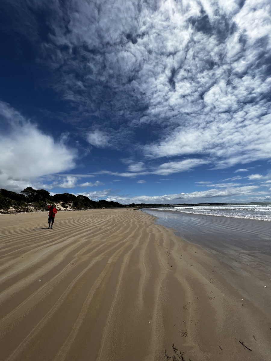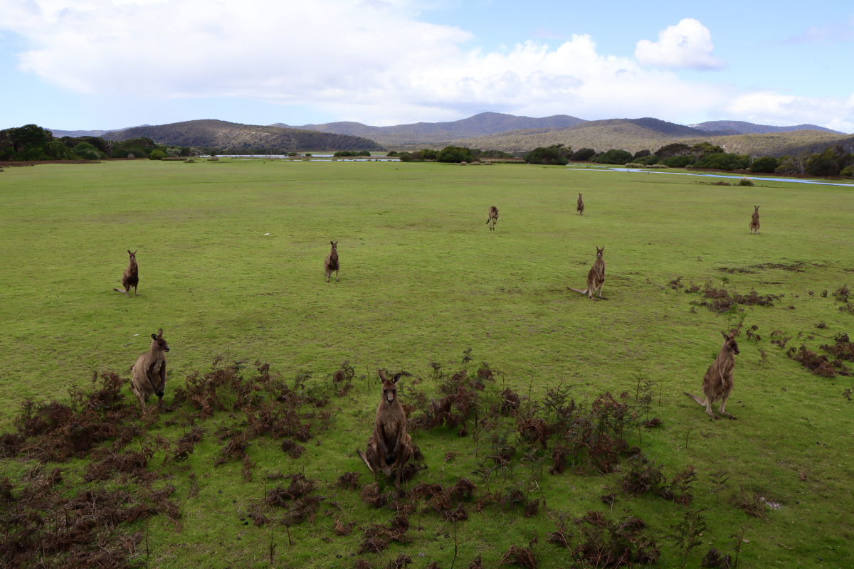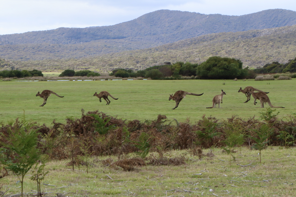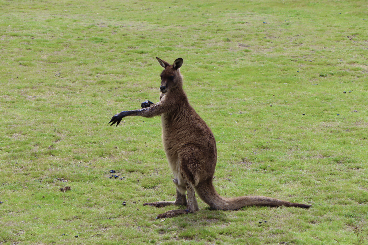 Nächster Stopp war der Narawntapu Nationalpark, direkt am Meer. Diesen können wir jedem uneingeschränkt empfehlen. Allein schon die Anfahrt bei herrlichem Sonnenschein, durch wunderschöne und vielfältige Landschaften, machten uns gute Laune. Im Nationalpark selber wurden wir mit einem unfassbar schönen, weitem Sandstrand konfrontiert, der extrem flach abfiel. Die Wellen waren ganz seicht, sodass es mit 10 Grad mehr der perfekte Ort gewesen wäre. Im Park sahen wir auch weitere Wollabys (quasi Mini-Kängurus) und Bandicots (sehen aus wie riesige Ratten). Generell ist es ganz cool in Australien, dass die Nationalparks mit dem eigenen Auto befahren werden dürfen. Wir waren sehr dankbar für unseren großen SUV, der auf den vielen Schotterstraßen eine gute Figur machte. Was wir hier auch das erste Mal sahen, waren wilde Kängurus. Eine Gruppe von ihnen präsentierte sich ordentlich auf einer großen grünen Wiese.