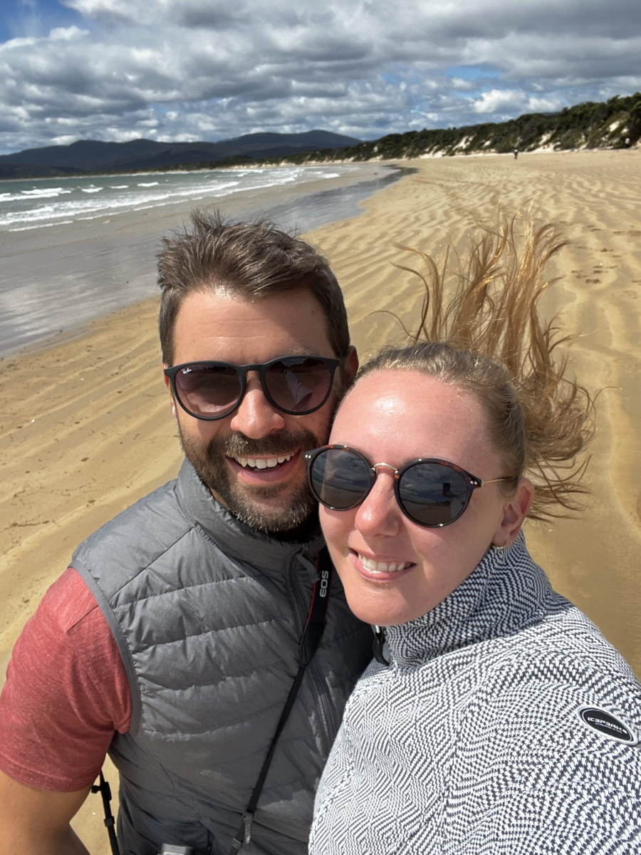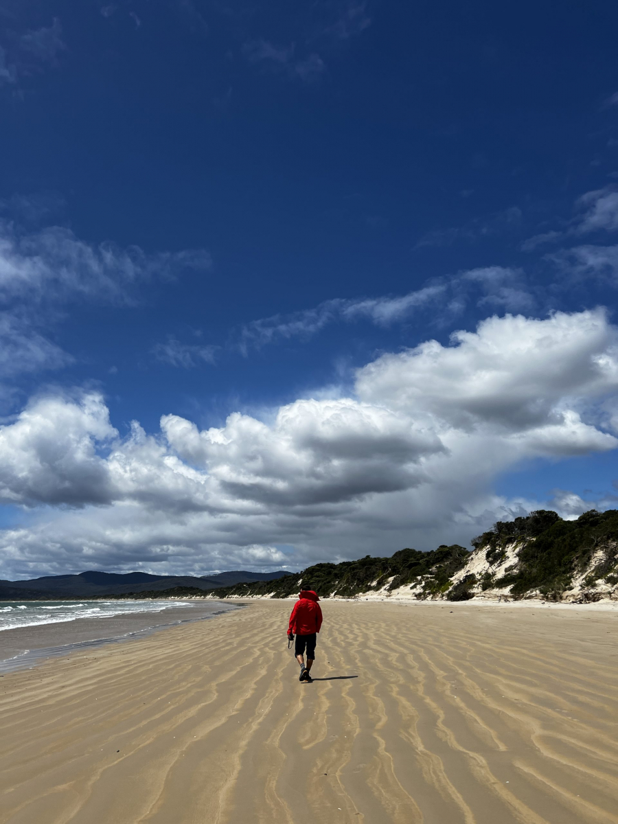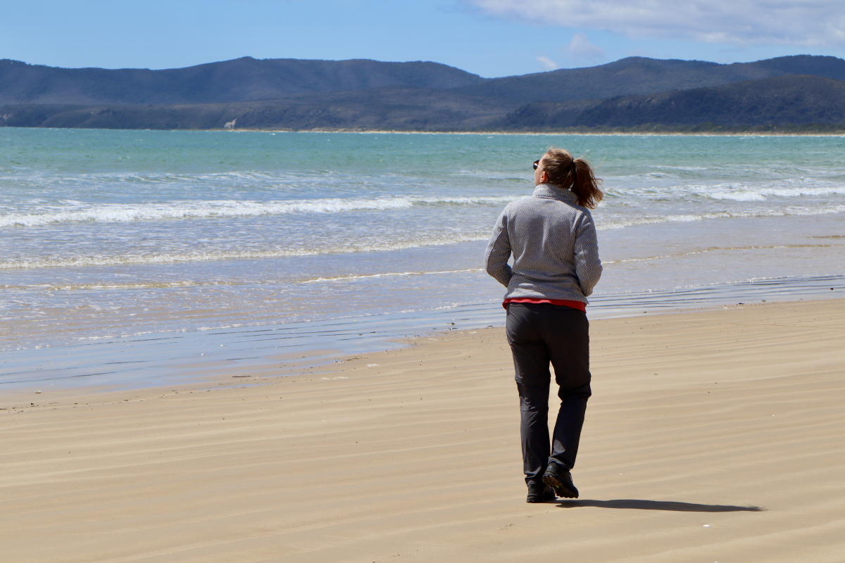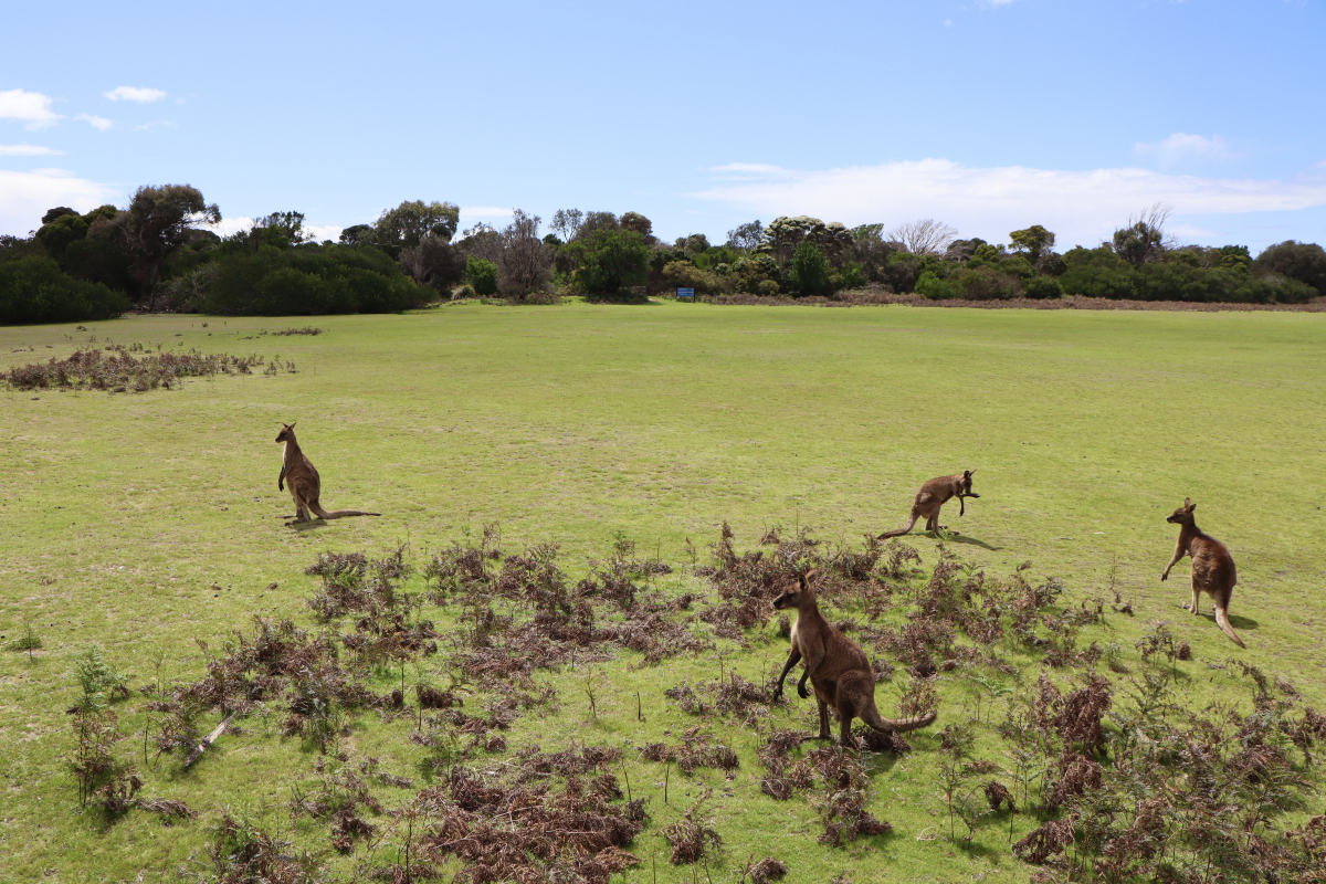 Nächster Stopp war der Narawntapu Nationalpark, direkt am Meer. Diesen können wir jedem uneingeschränkt empfehlen. Allein schon die Anfahrt bei herrlichem Sonnenschein, durch wunderschöne und vielfältige Landschaften, machten uns gute Laune. Im Nationalpark selber wurden wir mit einem unfassbar schönen, weitem Sandstrand konfrontiert, der extrem flach abfiel. Die Wellen waren ganz seicht, sodass es mit 10 Grad mehr der perfekte Ort gewesen wäre. Im Park sahen wir auch weitere Wollabys (quasi Mini-Kängurus) und Bandicots (sehen aus wie riesige Ratten). Generell ist es ganz cool in Australien, dass die Nationalparks mit dem eigenen Auto befahren werden dürfen. Wir waren sehr dankbar für unseren großen SUV, der auf den vielen Schotterstraßen eine gute Figur machte. Was wir hier auch das erste Mal sahen, waren wilde Kängurus. Eine Gruppe von ihnen präsentierte sich ordentlich auf einer großen grünen Wiese.