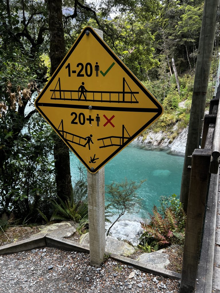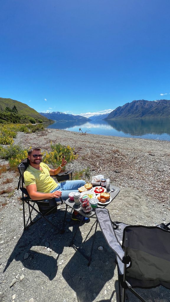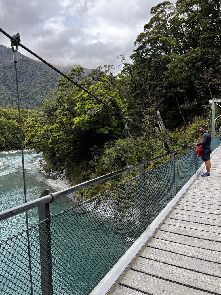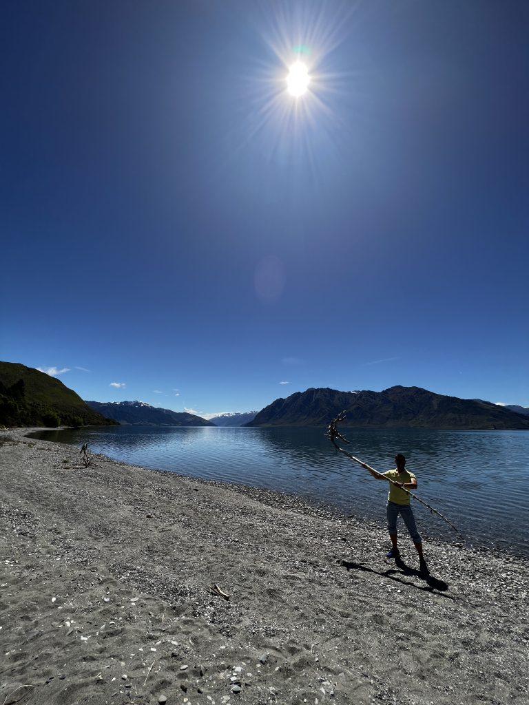 Morgens schien endlich einmal die Sonne, es verspricht ein wunderbarer Tag zu werden. Das Fußballspiel gegen Spanien lief auch ganz okay (auch wenn alles nix half) und danach fuhren wir los. Aufgrund des Wetters machten wir Halt am Hawea Lake. Der See war völlig ruhig und windstill. Und weil es echt warm war, zog ich tatsächlich zum ersten Mal den Bikini an und wollte reinspringen. Doch erst einmal frühstückten wir gemütlich. Und dann, von jetzt auf gleich, kam starker Wind auf. Mist. Mal wieder eine Wetter-Kapriole. Also nix mit Schwimmen. Stattdessen suchte Markus sich eine windstille Ecke bei einem Busch zum Lesen und ich machte ein Stündchen Yoga. Danach fuhren wir los über den Haast Pass zur West Coast. Unterwegs noch schnell Halt gemacht bei den sogenannten Blue Pools. Ein Flußbett mit besonders klarem, blauen Wasser. Wanderung circa eine Stunde. Nett, aber muss man auch nicht machen. Aber zwischen den Autofahrten eine gute Abwechslung.