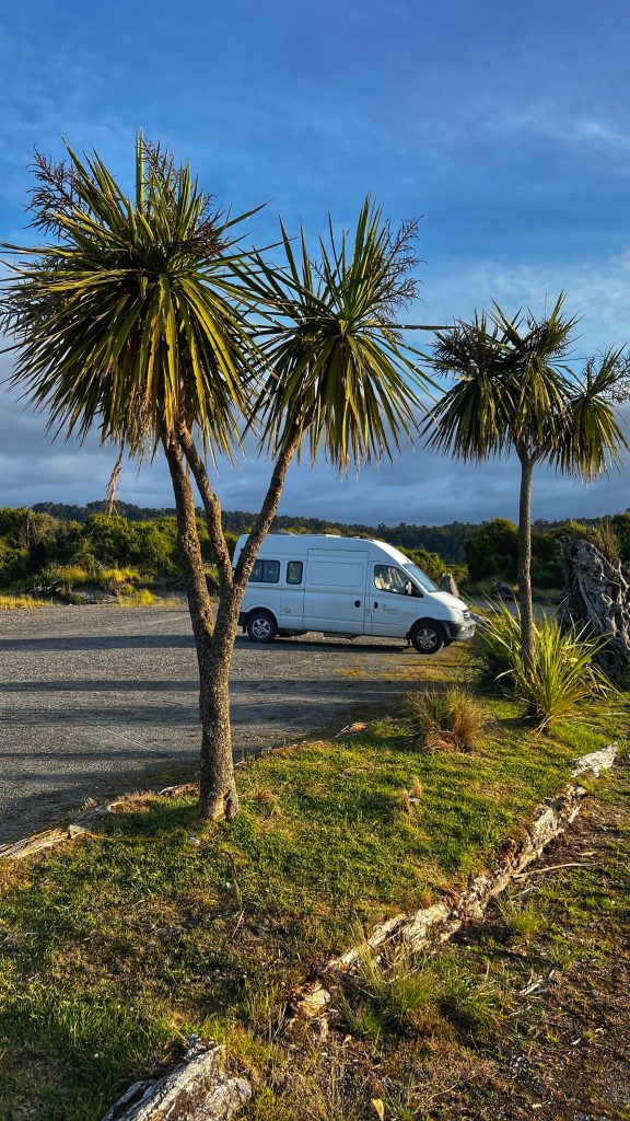 An der West Coast erwartete uns: Regen. Oh man. Wir hielten mal kurz an einem Strand und fuhren dann direkt zu unserem Übernachtungsplatz und zwar am Gillespies Beach. Bis dahin mussten wir circa 15 Kilometer Gravel Road aushalten. Der Strand war ganz nett. Ausnahmsweise komplett steinig, habe ich so auch noch nicht oft gesehen. Aber so richtig hat uns die Westküste nicht gepackt.