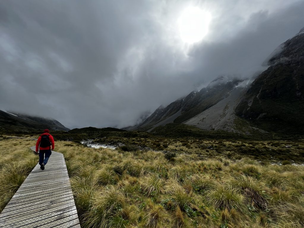 Von unserer See-Übernachtung fuhren wir in den Mount Cook Nationalpark, um den Hooker Valley Track zum Hooker Glacier (Gletscher) zu laufen. Kleine Völkerwanderung, da sehr beliebt. Dauer etwa drei Stunden, aber keine wirklichen Höhenmeter. Es ist kalt, usselig und vernebelt. Keine Chance auf einen klaren Blick zum Mount Cook. Der Gletschersee ist schön und man sieht vereinzelt Gletschereis darin schwimmen. Der Track an sich ist auch schön. Wir können verstehen, wieso ihn viele laufen.