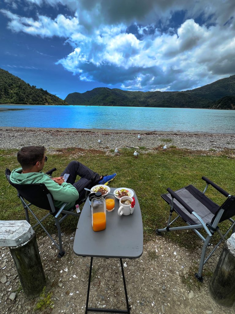 Nach einem Spaziergang fuhren wir dann weiter zu unserem Übernachtungsspot bei Blenheim. Diesmal machten wir wieder Free Camping und zwar am Whites Bay Beach. Er liegt etwas versteckt und man fährt erst einmal eine sehr kurvige, enge Küstenstraße dorthin. Aber es lohnt sich! Weiß war hier allerdings nichts, denn der Sand ist vulkanisch und damit schwarz. Die Kapazitäten der Plätze sind noch lange nicht ausgeschöpft, also war es angenehm ruhig und leer.