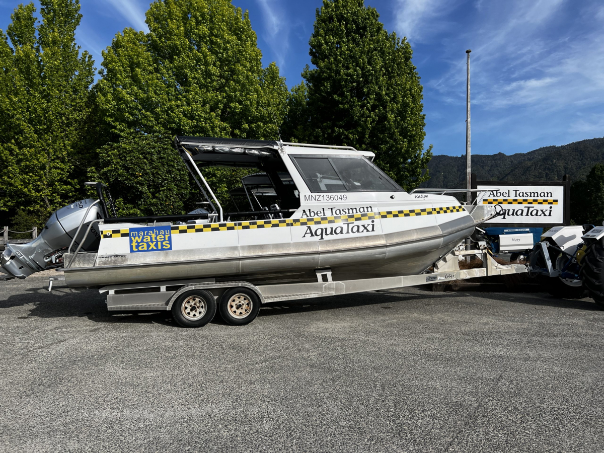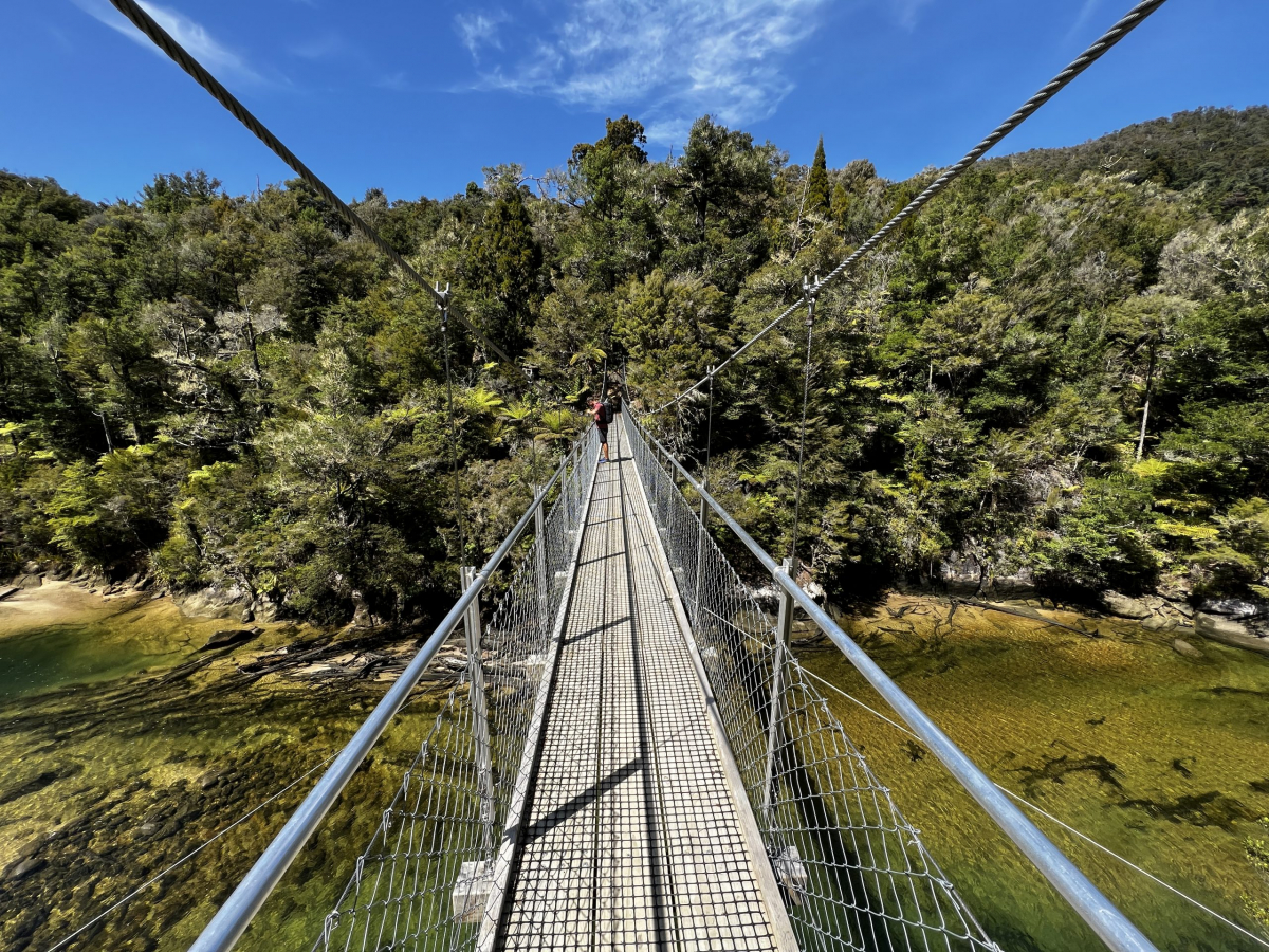 Von St. Arnaud ging die Tour weiter in den Abel Tasman Nationalpark, ganz im Norden der Südinsel. Das Wetter zeigte sich endlich von seiner sonnigen Seite. Diesmal blieben wir zwei Nächte im Mārahau Beach Camp – das erste Mal in den über zwei Wochen im Camper. Wir hatten aber auch etwas Besonderes vor: Am nächsten Tag fuhren wir mit dem Wasser-Taxi an der Küste hoch in den Nationalpark. Aber wer jetzt glaubt, wir wurden an irgend einem Fährhafen oder Anlegestelle abgeholt: Weit gefehlt. Wir stiegen an Land aufs Boot und das Boot wurden dann mit dem Traktor ins Wasser gebracht. Aufgrund von Ebbe und Flut die beste Möglichkeit. Wir wurden an einem einsamen Strand rausgelassen und dann ging es den Abel Tasman Track (einer der Great Walks in Neuseeland) die Küste entlang. Sechs Stunden später wurden wir dann an einem Treffpunkt wieder abgeholt. Der Walk war wirklich toll, weil es traumhafte Ausblicke auf Strände gab, wir über grandiose Brücken liefen und es einen tollen Mix aus Regenwald und Küste zu sehen gab. Allerdings war es Markus ein bisschen zu eintönig, ihm fehlten die Berge, obwohl wir durchaus einige Hügel zu erklimmen hatten. Und wir liefen mehrheitlich im Wald und weniger an der sonnigen Küste. Wobei das gut war, denn es war echt schön warm. Am Treffpunkt konnten wir noch eine kurze Zeit am Strand verbringen und stellten fest, dass das Wasser noch sehr kalt, aber erfrischend war.