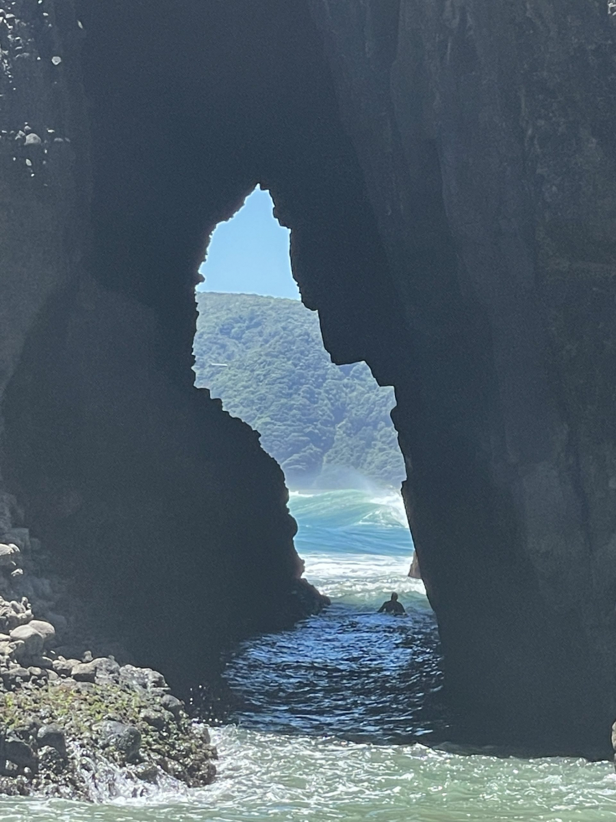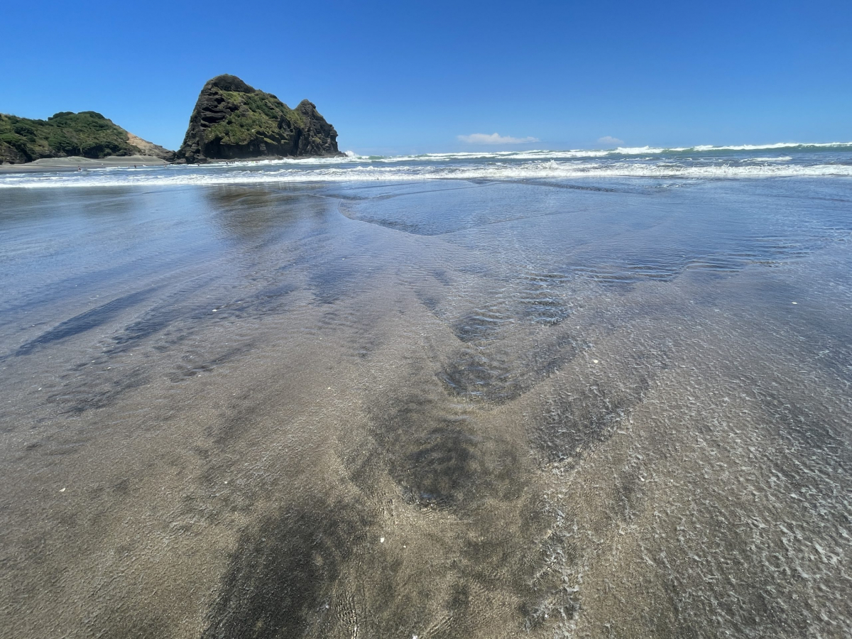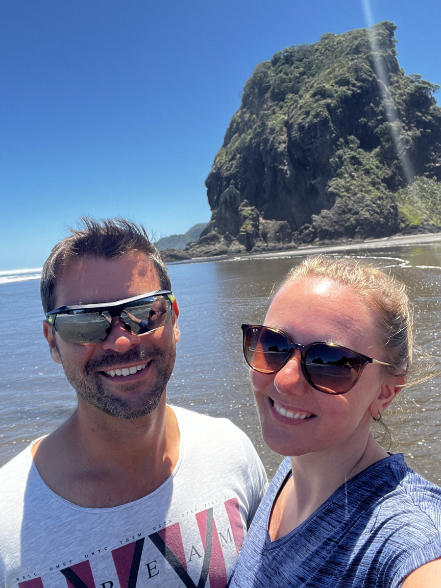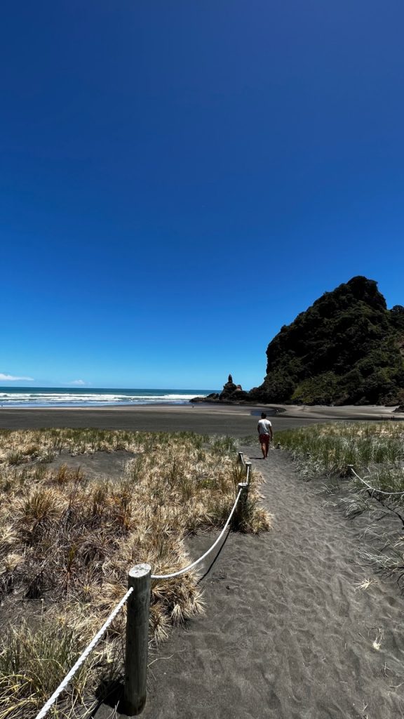 Wir besuchten zuerst Piha. Ein kleines Dörfchen, fast ein bisschen versteckt im Waitakere Ranges Nationalpark. War auf der Liste der schönsten Strände mit dem besonderen, vulkanisch schwarzen Sand. Und es war wirklich beeindruckend. Hat uns deutlich besser gefallen als Cathedral Cove. Auch hier gab es Felsen mit Durchgang, die das Meer zeigten. Aufgrund des grandiosen Wetters entschieden wir uns für einen entspannten Strandtag.